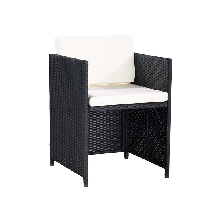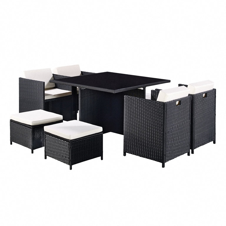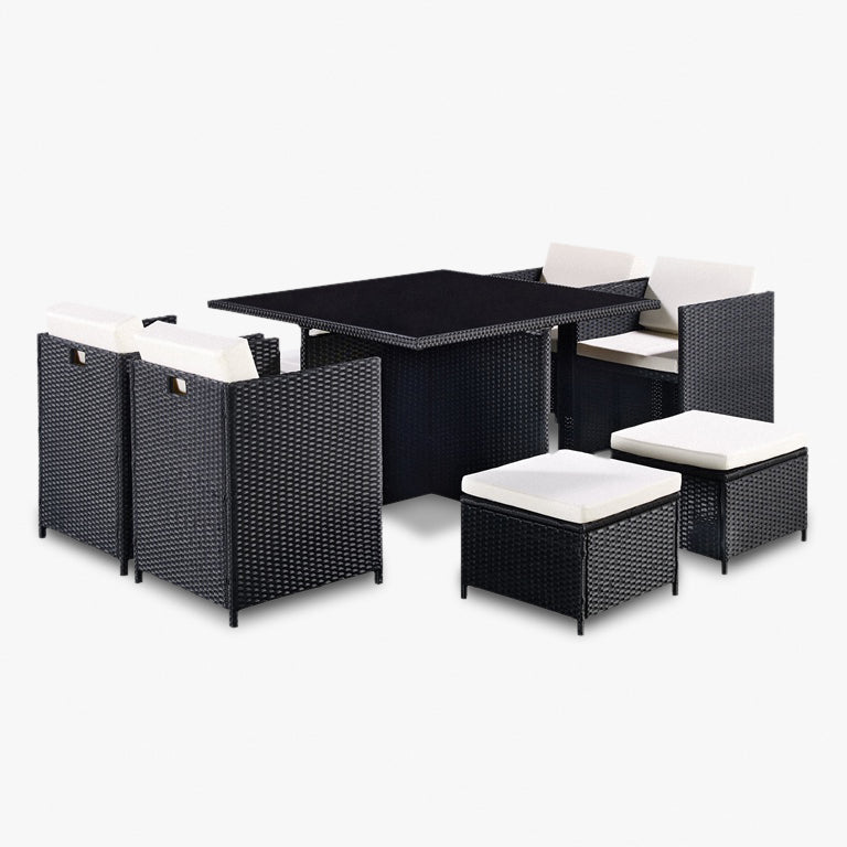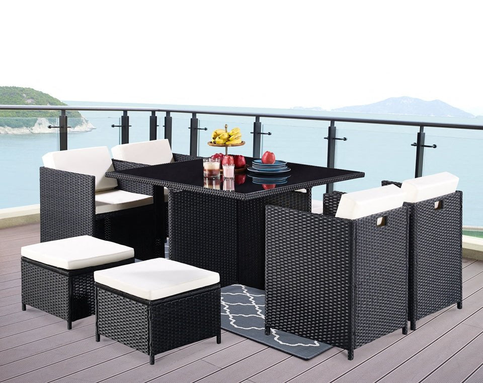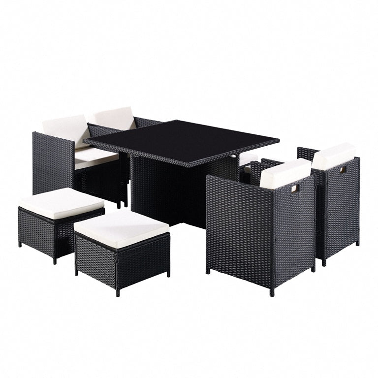 This listing is for a beautiful nine piece garden furniture set. It is available in black colour. This set would make the perfect addition to your home and your garden. It is perfect for sitting comfortably on a nice day or night. It comes with 1 dining table, 4 garden single chairs, and 4 garden stools allowing a maximum of 8 people to sit at and enjoy. This garden set is made from PE rattan, modern and stylish for any garden! This garden set comes with a free cover included protecting your rattan garden set when not in use.