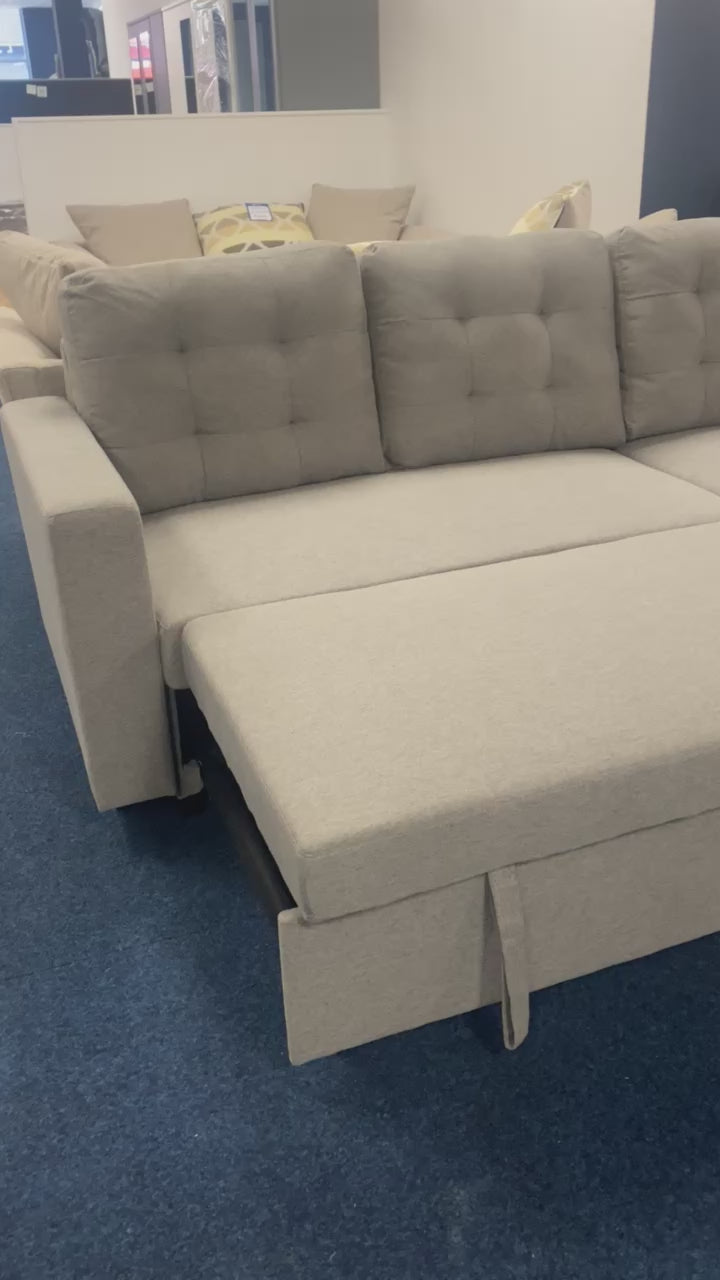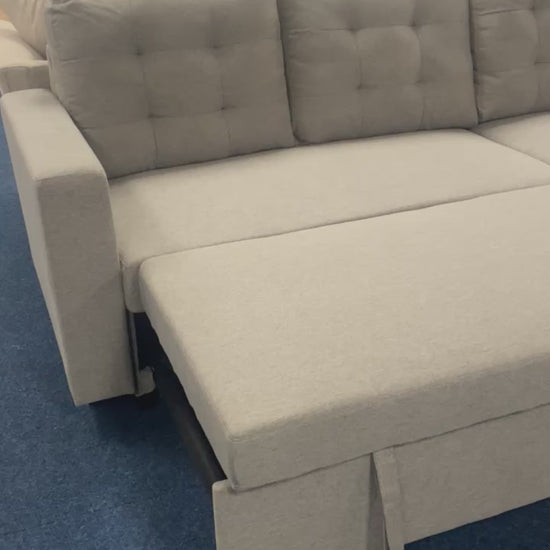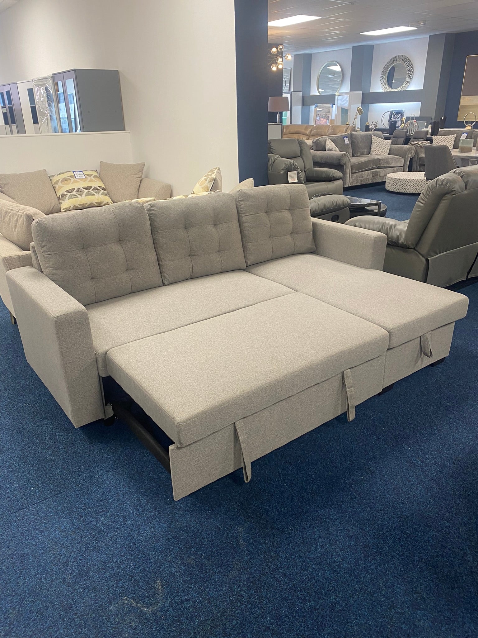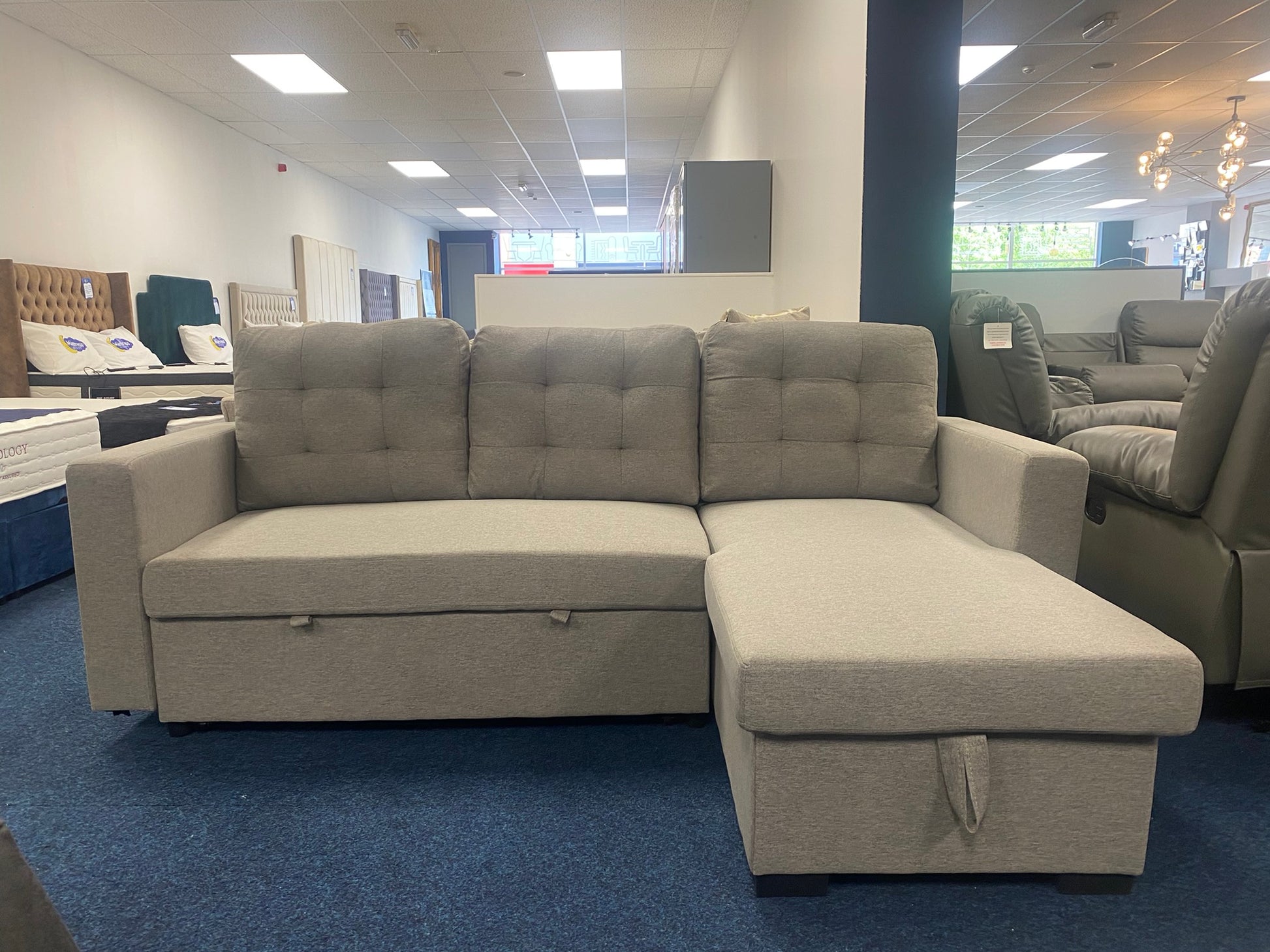 A solution for modern living, this light grey corner sofa bed combines comfort, practicality and space-saving versatility. Designed with deep padded cushions, a pull-out sleeping section, and generous hidden storage in the chaise, it's ideal for everyday lounging and overnight guests. The soft-touch upholstery and tufted back cushions bring a sleek, tailored finish that complements any interior.