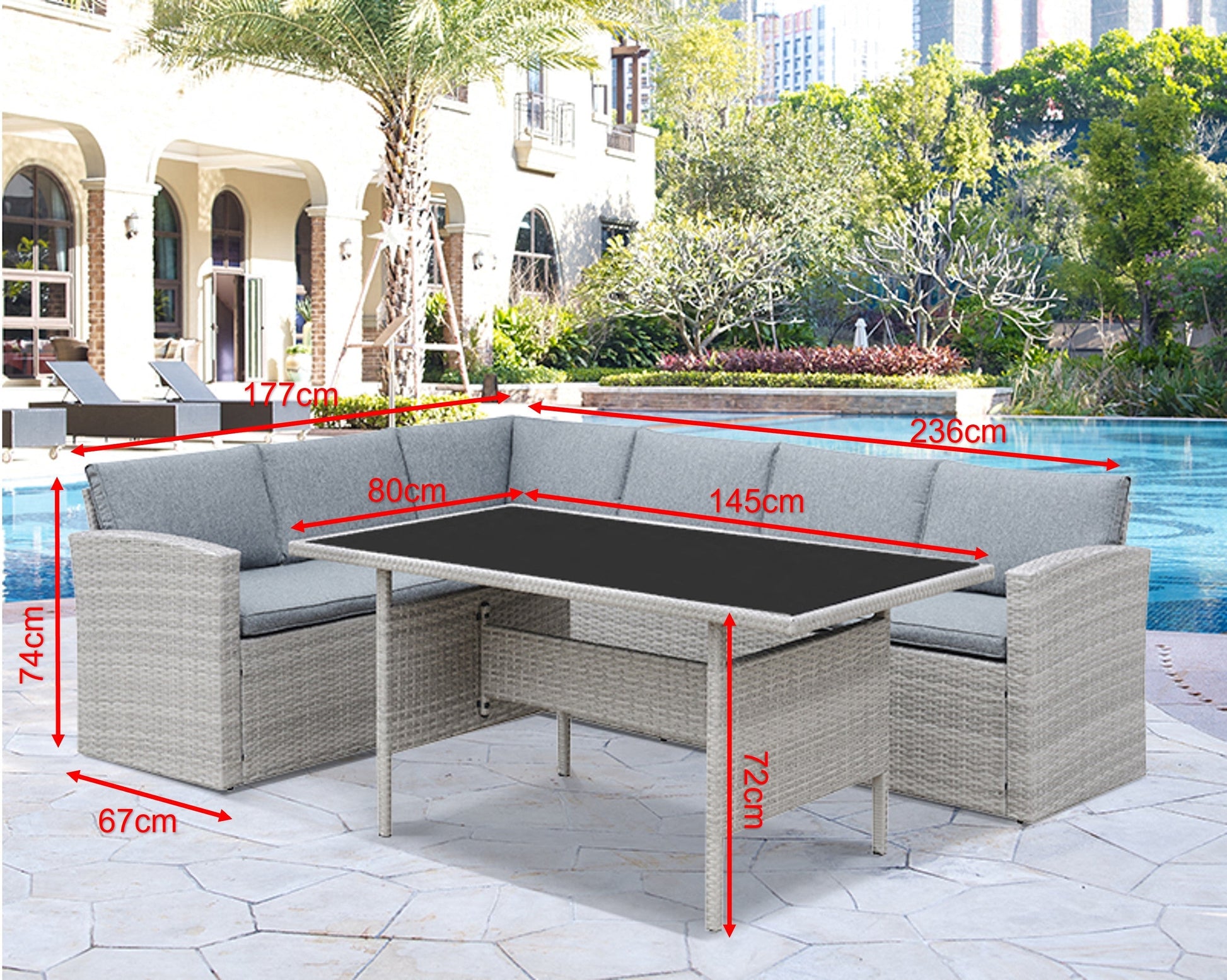 Introducing our gorgeous Louisa corner garden set, paired perfectly with a glass topped dining table! Dine al fresco in the sunshine, in style of course! Our Louisa garden dining set is modular in design so that moving your garden set around your garden space is easy. No need to dismantle, when you can move more manageable pieces.