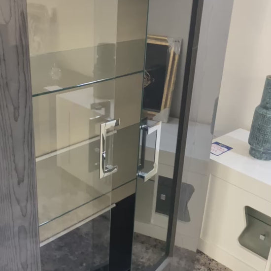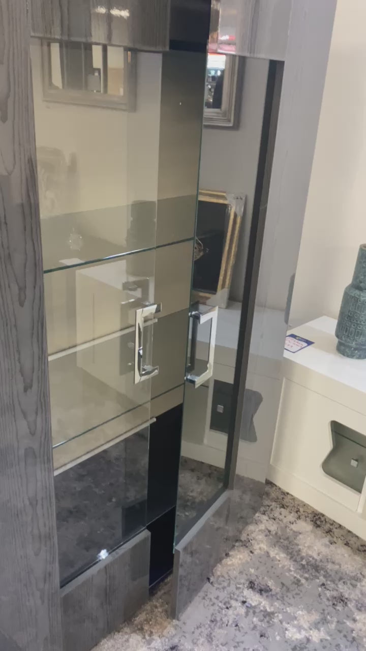 This elegant tall display cabinet is a one-off ex-display clearance item, perfect for adding structure and shine to your dining room, hallway, or living space. The design blends a rich high-gloss grey wood grain finish with smoked glass doors and chrome square handles for a bold yet refined look.