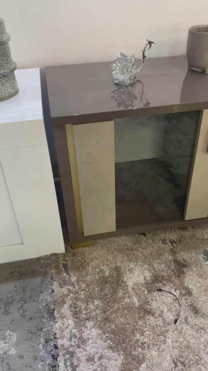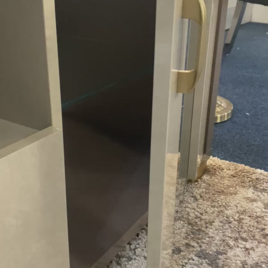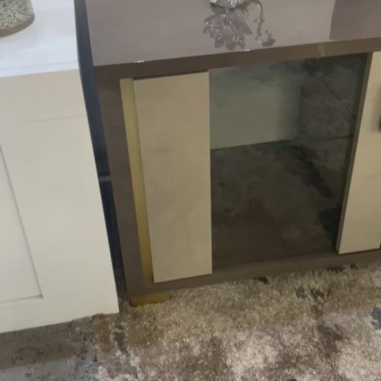 Elevate your living space with this one-off ex-display TV cabinet, crafted in a modern Italian design. Featuring a clean blend of taupe matte textures, smoked glass doors, and brushed gold accents, it offers understated luxury with practical storage.
