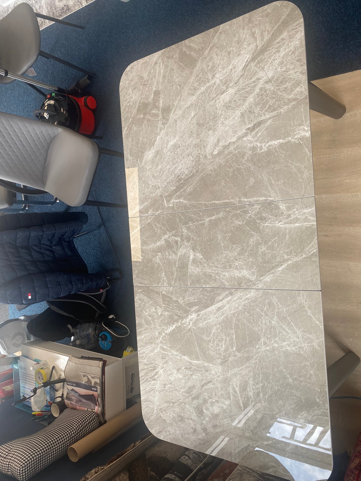 - Includes 4 diamond-stitched grey chairs with black tapered legs