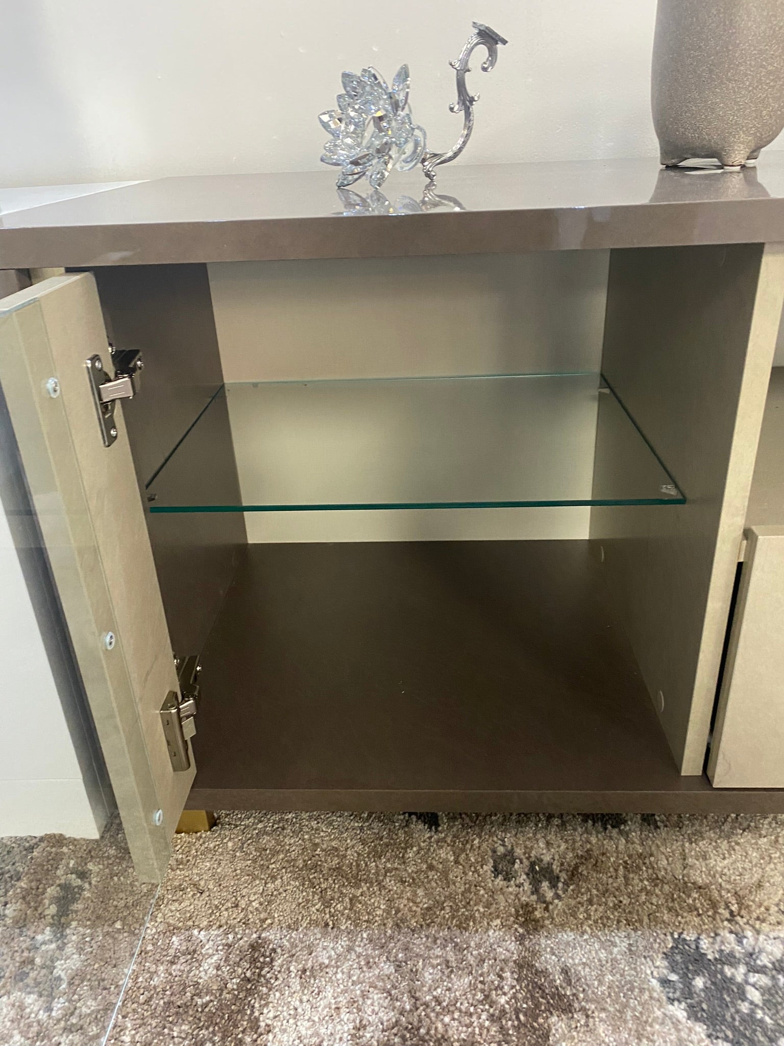 Elevate your living space with this one-off ex-display TV cabinet, crafted in a modern Italian design. Featuring a clean blend of taupe matte textures, smoked glass doors, and brushed gold accents, it offers understated luxury with practical storage.