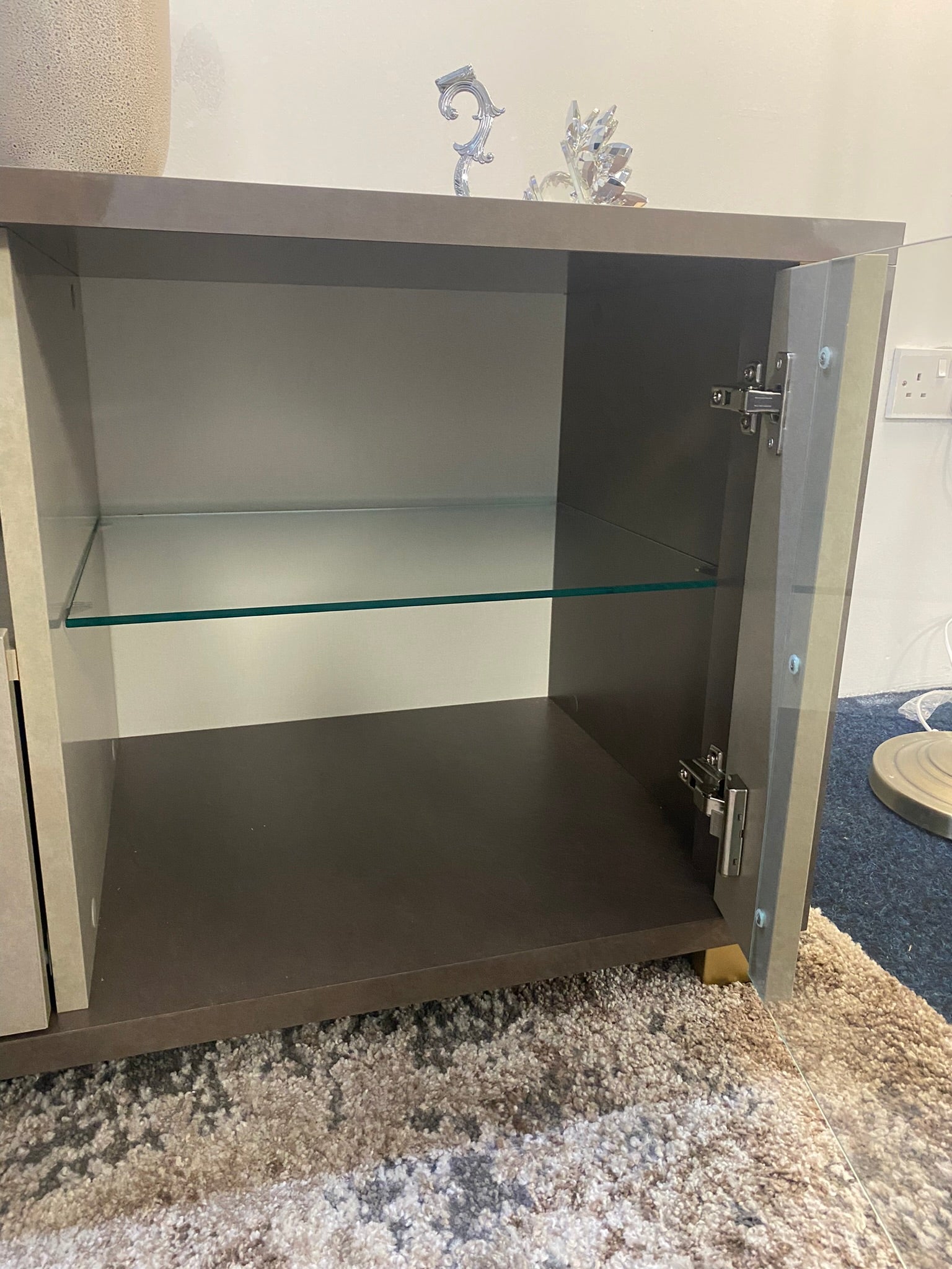 • 🖼️Smoked glass side doors with internal shelving.